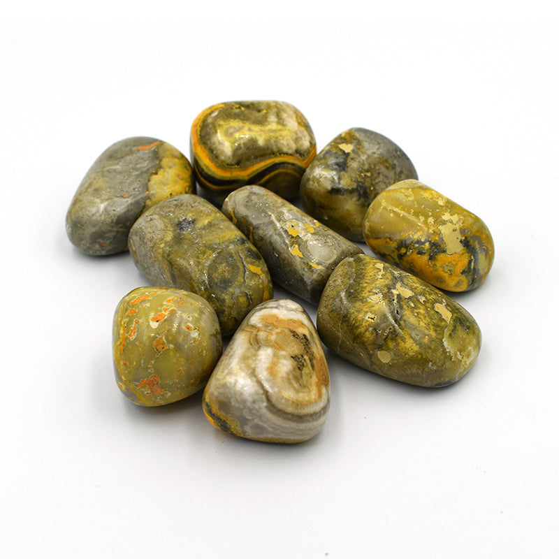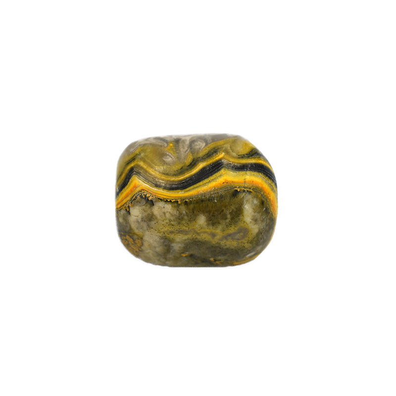 Proprietà: Il diaspro bombo stimola la creatività e aiuta a realizzare nuovi progetti. Stimola a intraprendere nuove imprese e aiuta a prendere decisioni rapidamente. I suoi colori variano dall'arancione al giallo e al nero. E' formato da una miscela di lava vulcanica indonesiana e sedimenti. Scoperta per la prima volta sull'isola di Java durante gli anni '90. I bei motivi su questa pietra spesso imitano la colorazione trovata sui bombi, da cui il nome. È una forte pietra di energia terrestre. Incarna al suo interno la forte energia del vulcano da cui è nato.