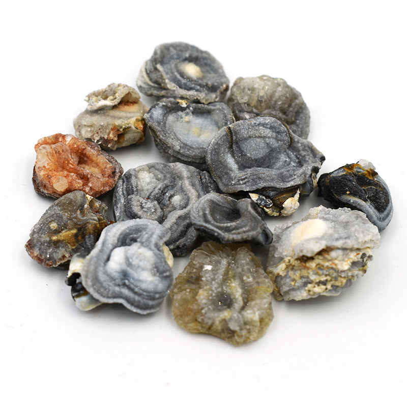 Proprietà ed usi: Questo particolare tipo di Agata (pietra appartenente alla famiglia dei Calcedoni) presenta sulla sua superficie delle minuscole formazioni di Quarzo Ialino che la rendono particolarmente brillante. Come Agata aiuta a equilibrare il pensiero e a renderlo più logico, stabile e preciso.